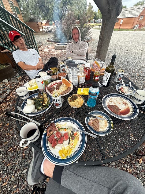 I took it on myself to ensure we had the finest finale meal before heading to party in civilization. So we took a trip to Walmart, poured red wine in coffee glasses, and I grilled all the steak, brats, and veggies you can imagine. Laughing until late at night around the campfire, it was a successful wilderness adventure.