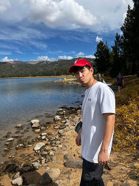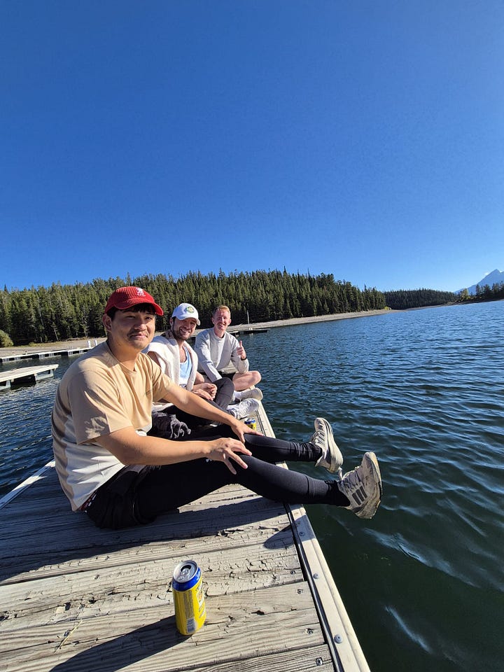 After denting the car hood, it was time for some sit ups on a dock next to a basin lake of Grand Teton!