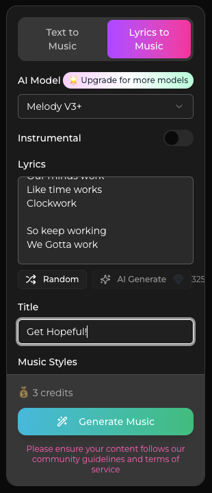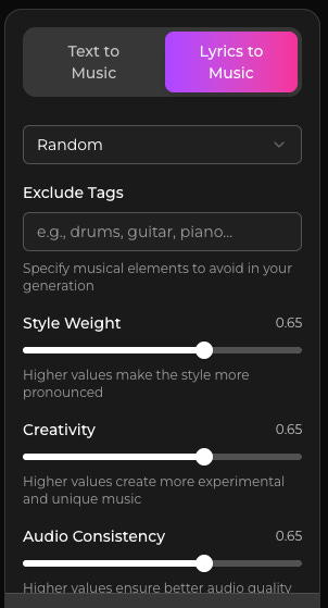 After establishing the lyrics, you set AI model parameters