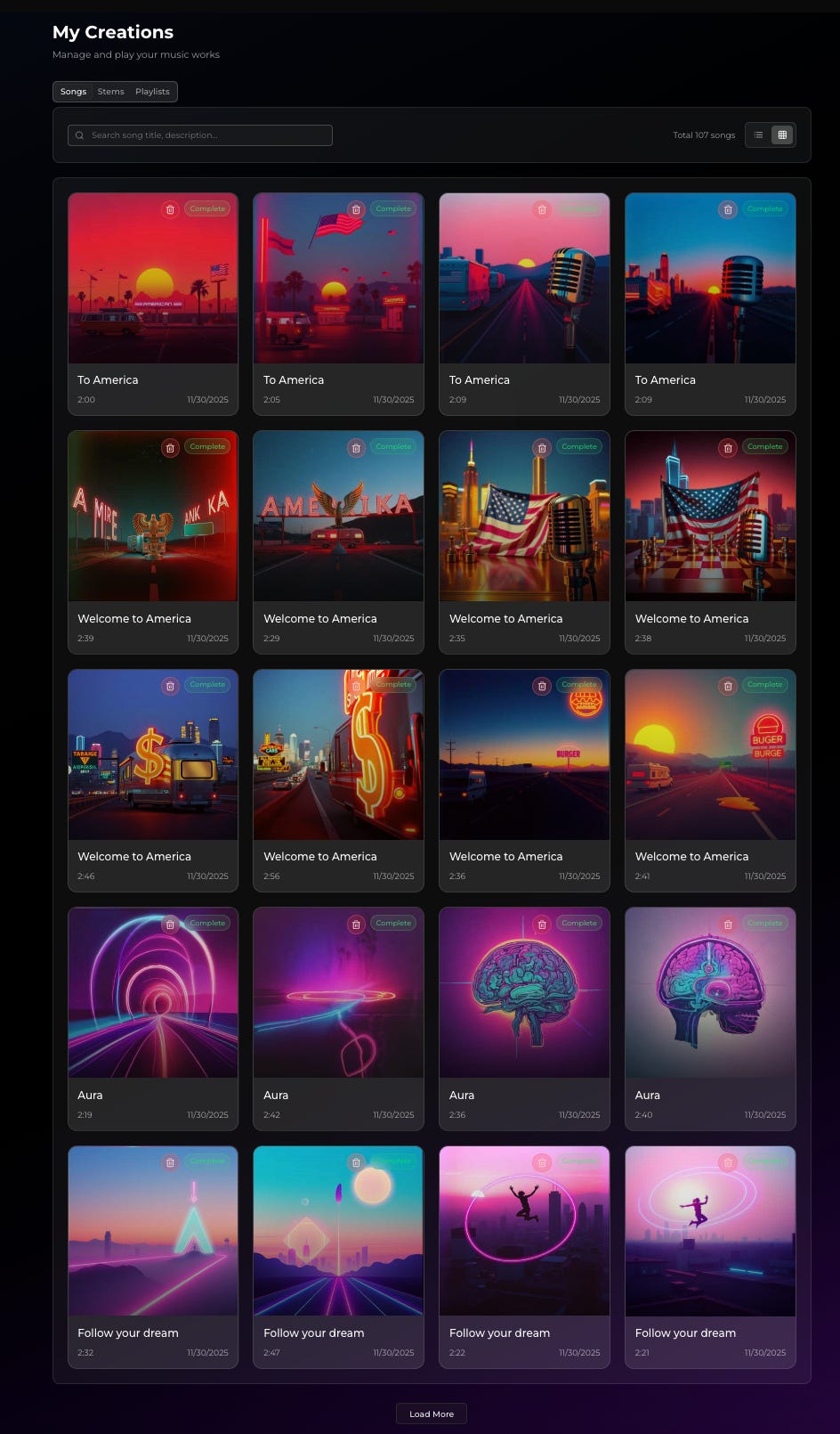 Don’t laugh, but after creating my first song.. I then locked in and spent the next 48 hours building 107 songs. You can see my library below: