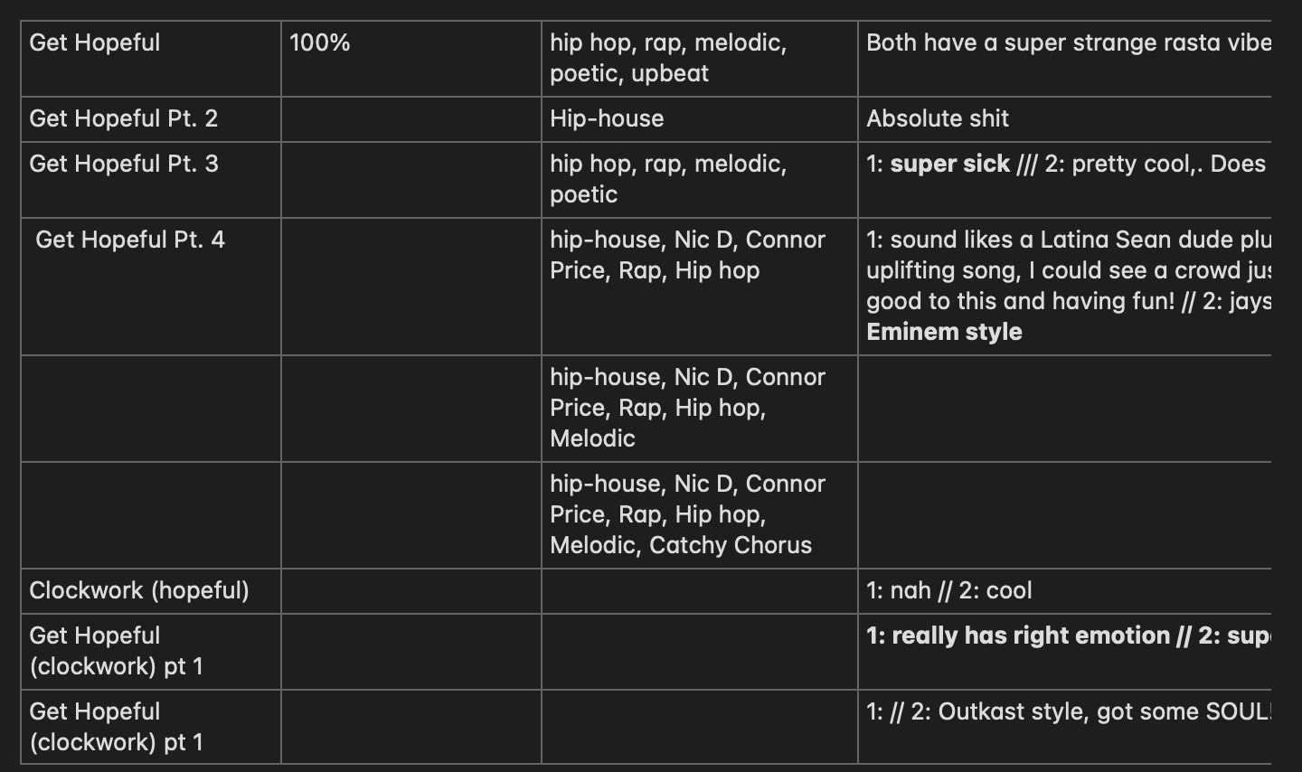 You can see the various notes I took after each song.