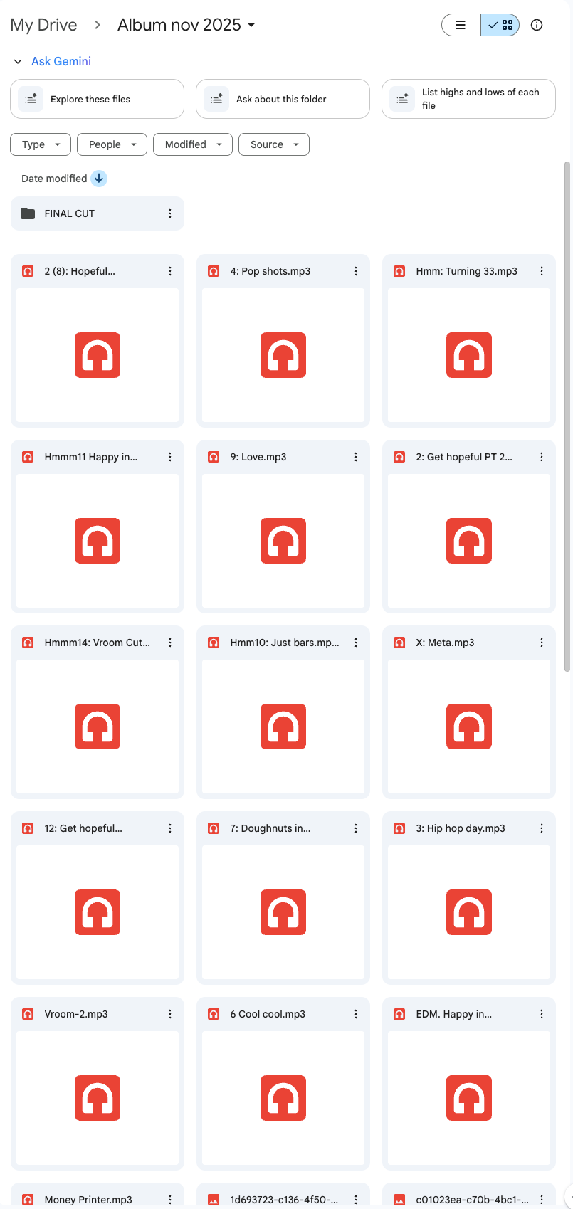 Once I had 107 songs, I then listened to each one, and aggressively cut 97 of them. Leaving me with the top 10. I created a folder in my Gdrive, and then downloaded each of the audio files uploaded to my Album Folder.