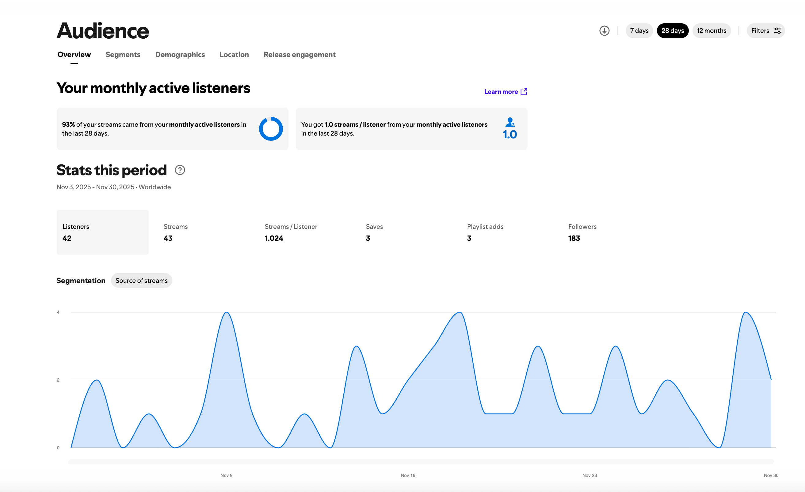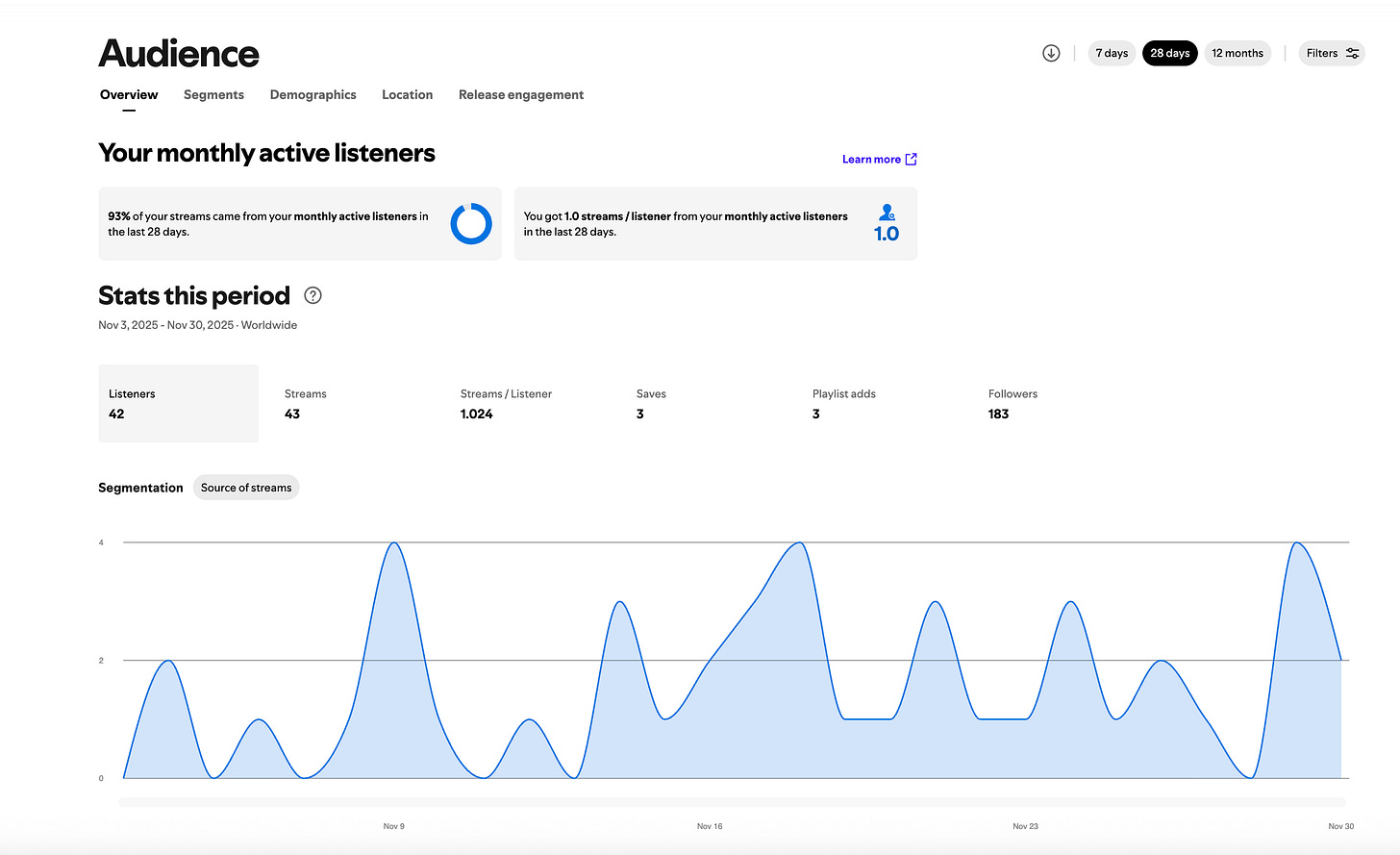 After you publish, you’ll be able to log into Spotify for Artists (the native Spotify suite) where you can get your listener data. Here are my stats from the last 28 days. Kinda famous…!
