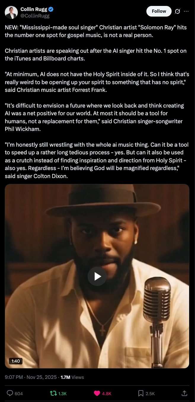 Here’s an AI artist who just hit #1 on the charts… incredible. (link to tweet)