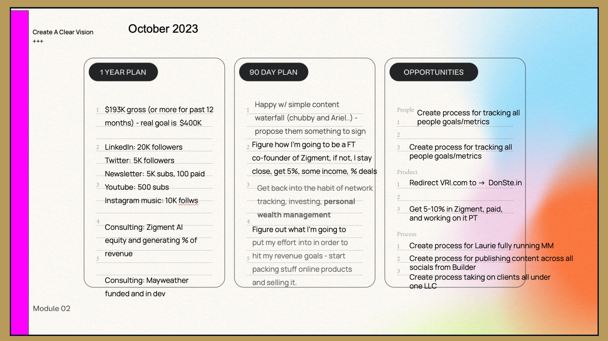 By filling out this slide each month, I’m forcing myself to create some foresight around both near term goals (90 days) and longer term goals (1 year).
