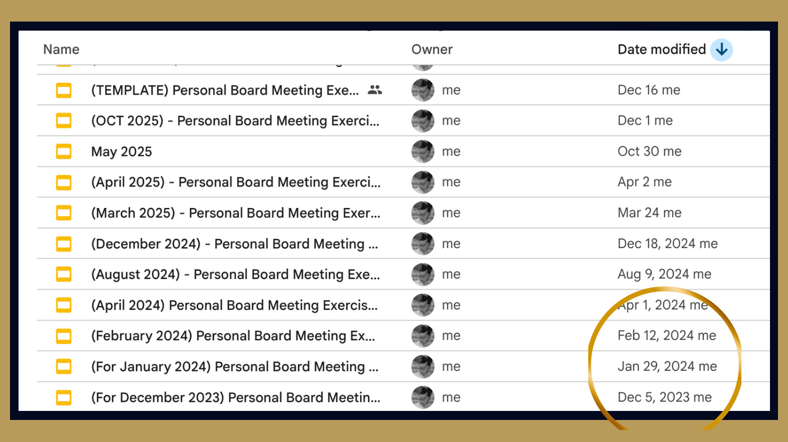 There’s a reason CEO’s have board meetings.. and now, as the CEO of your own life, you’re going to host them too. It sounds simple. Almost boring. But it has been one of the most stabilizing practices I have ever adopted. Once a month, I run a personal board meeting, and as you can see below, I’ve been running them on a monthly basis for years.