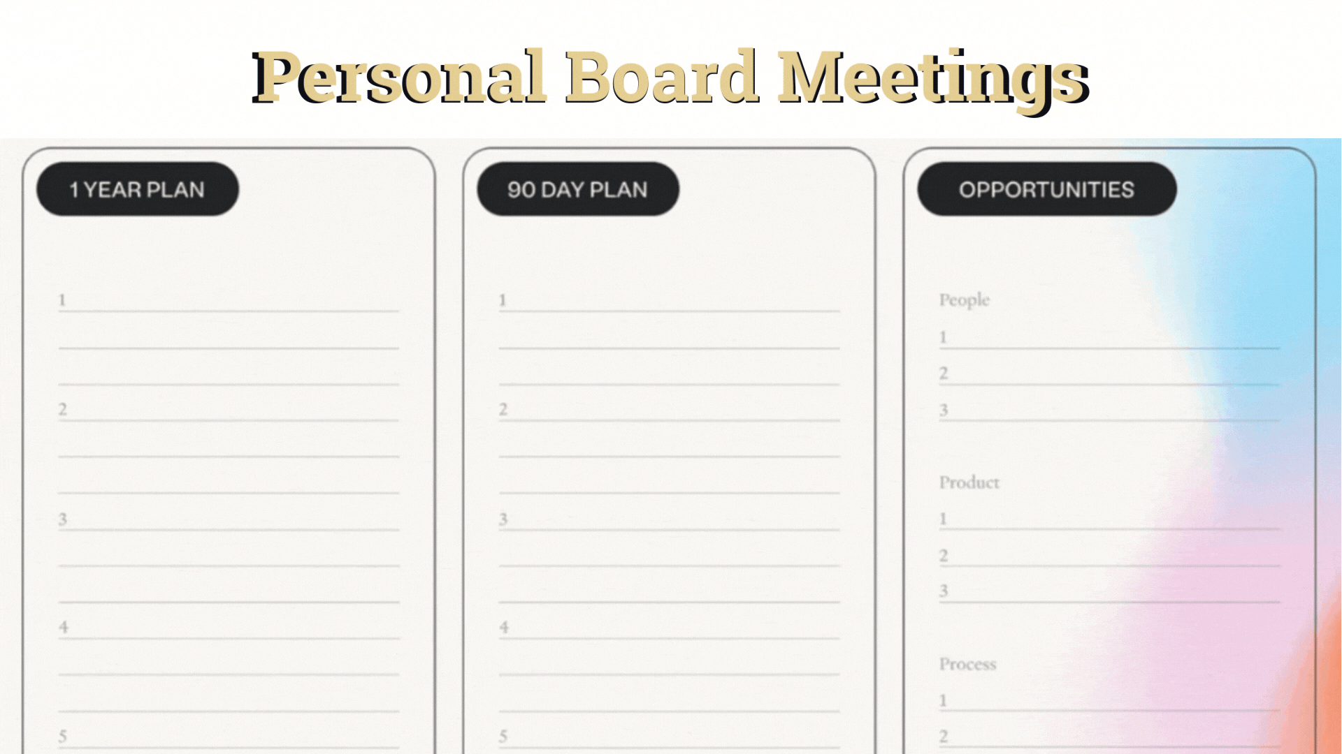 Today we’re going to break down the practice of ‘personal board meetings.’ These are defined as monthly meetings you set with yourself. In these meetings, you act as both the operator and the board advisor. Your goal is to leave each exercise with some clarity, and a plan for the upcoming month.