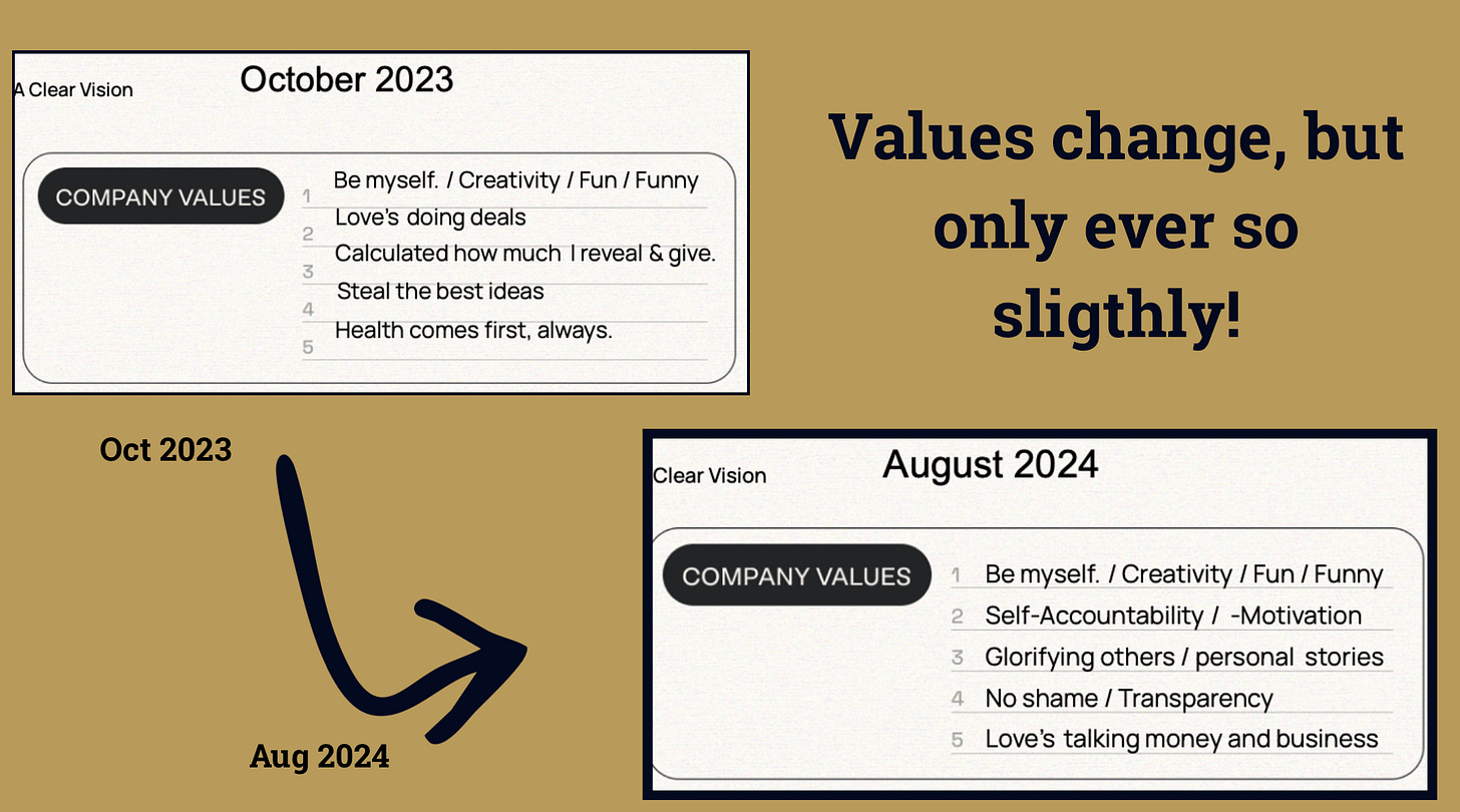 For example, in October 2023, one of the values I listed was, “steal the best ideas.” This was because at the time I was in full on marketing mode, and the best way to gain traction is to find content that works, then remix it. Now instagram built these tools into the platform, but back then it worked really well! And maybe that’s why in 2024 that value is no longer there.