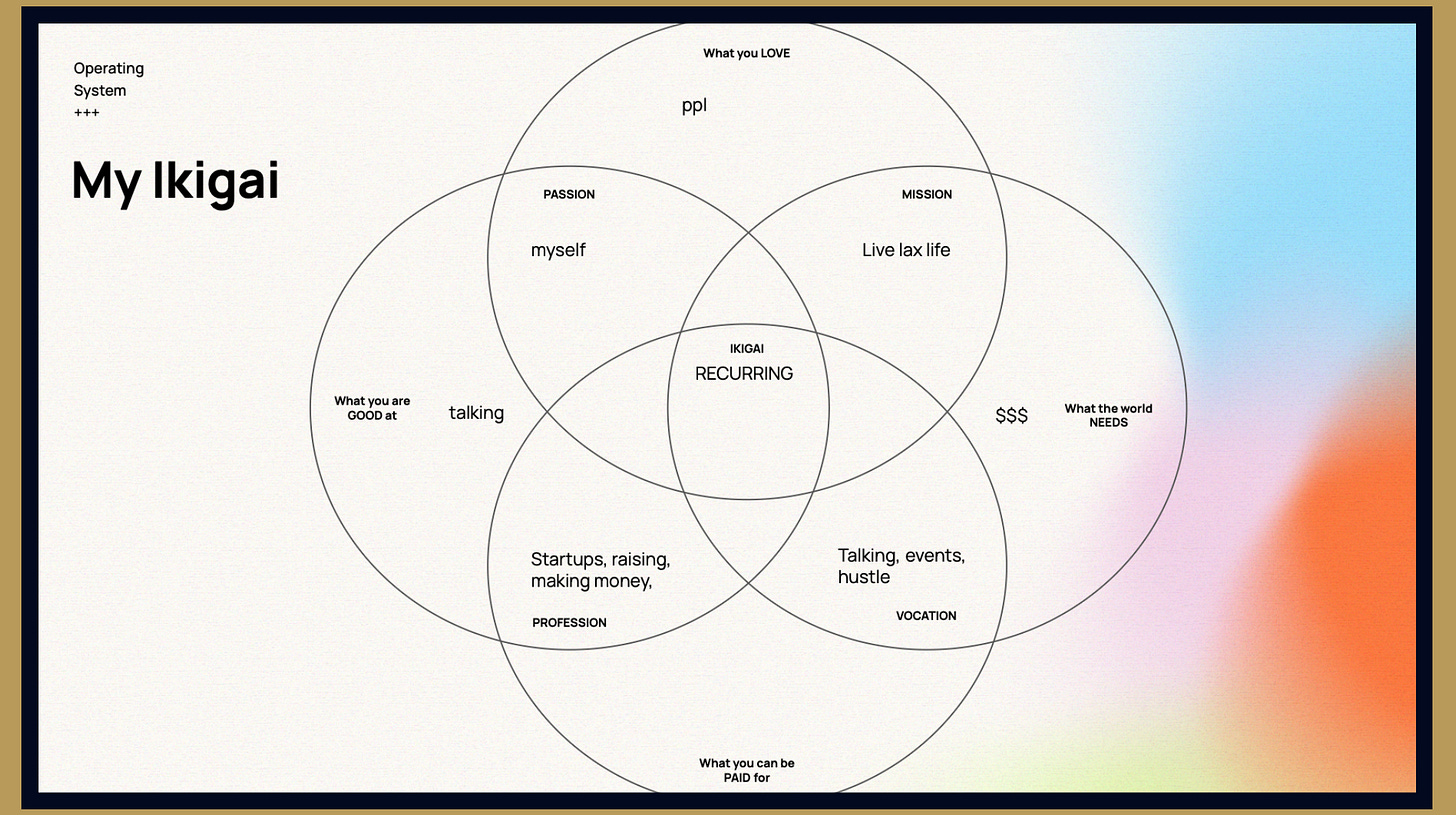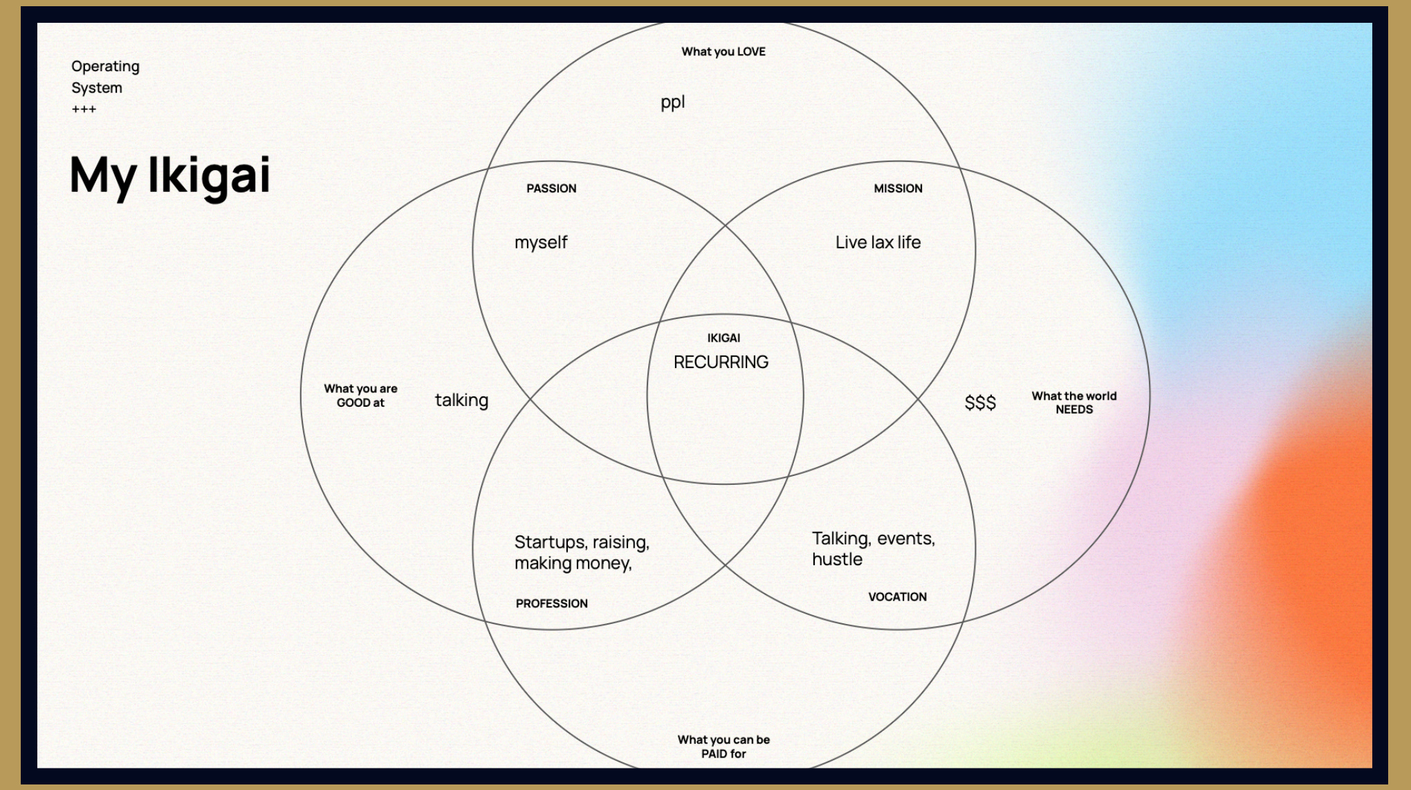 For example, I’m quite good at hosting events, talking, raising money for startups, and, I love people. All those realizations are what led me to creating my last business, which was a member-based online events company for startups. Thank you, IKIGAI!