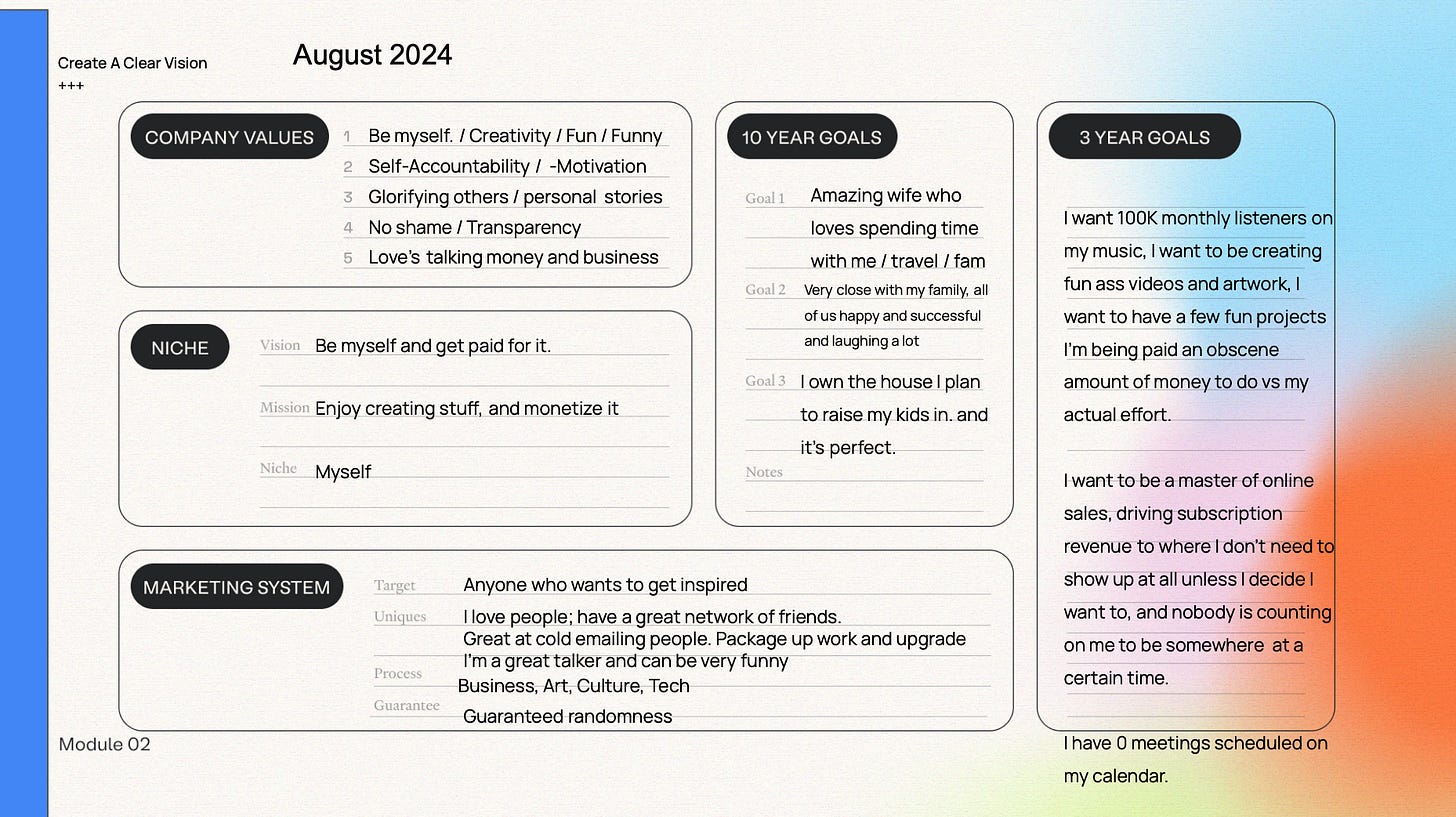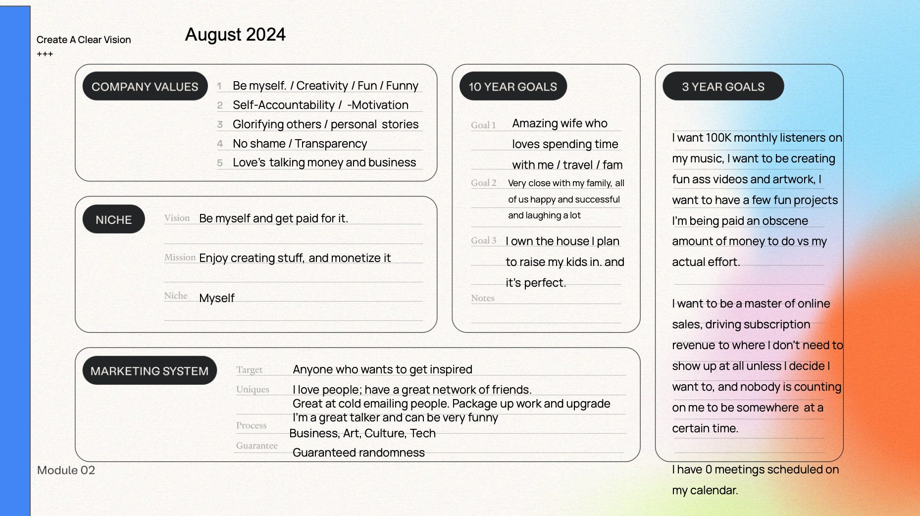 This is an actual screenshot from my personal board meeting August 2024. My favorite part of this slide is filling out the ‘company values,’ aka, my personal prioritized values for that month.