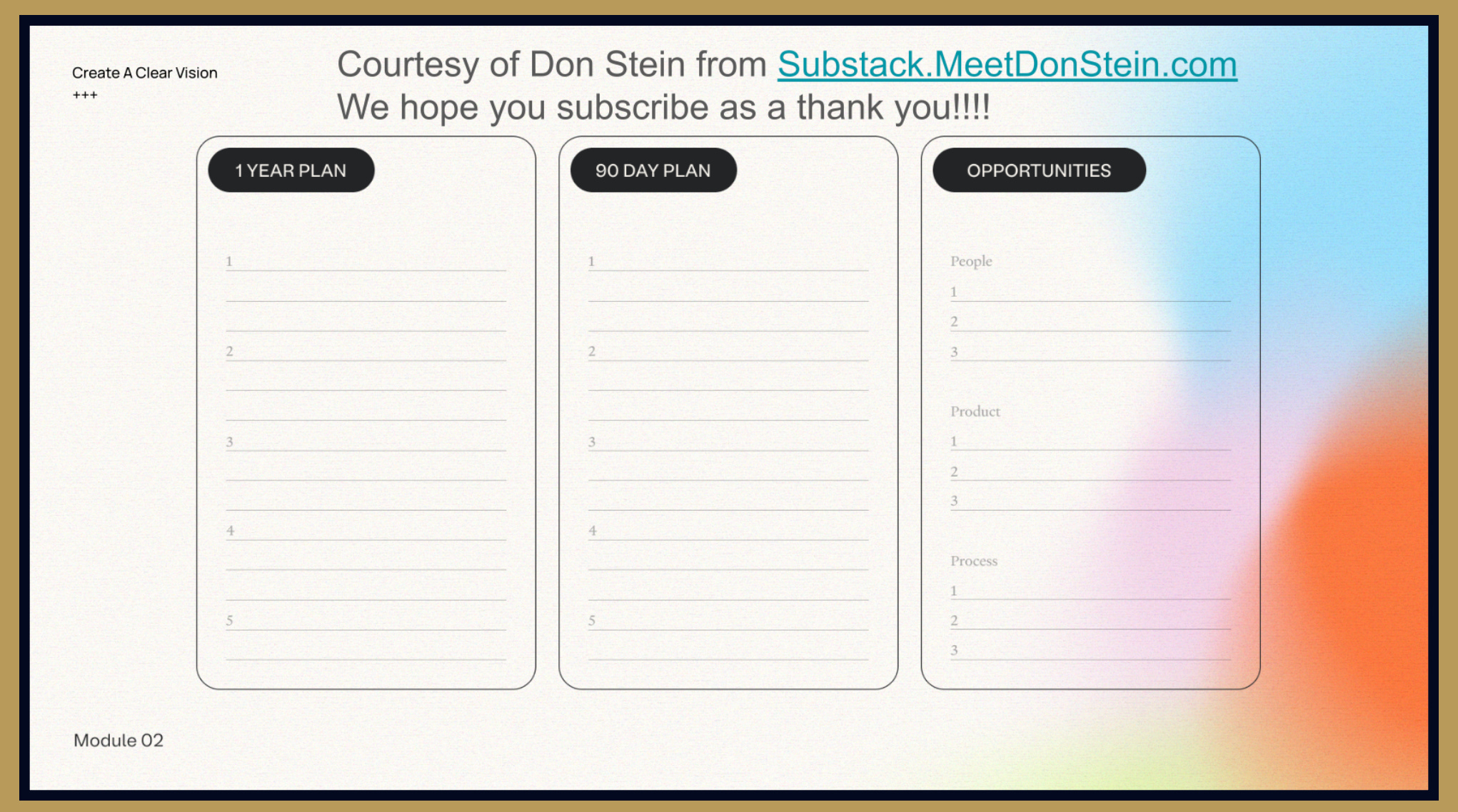 Just like a real company, everything ‘we’ discuss. (aka me, myself, and I) revolves around a structured template. There are three core parts to the template, I’ll break them down for you. And then provide you a blank template so you can begin the same practice with my outline.